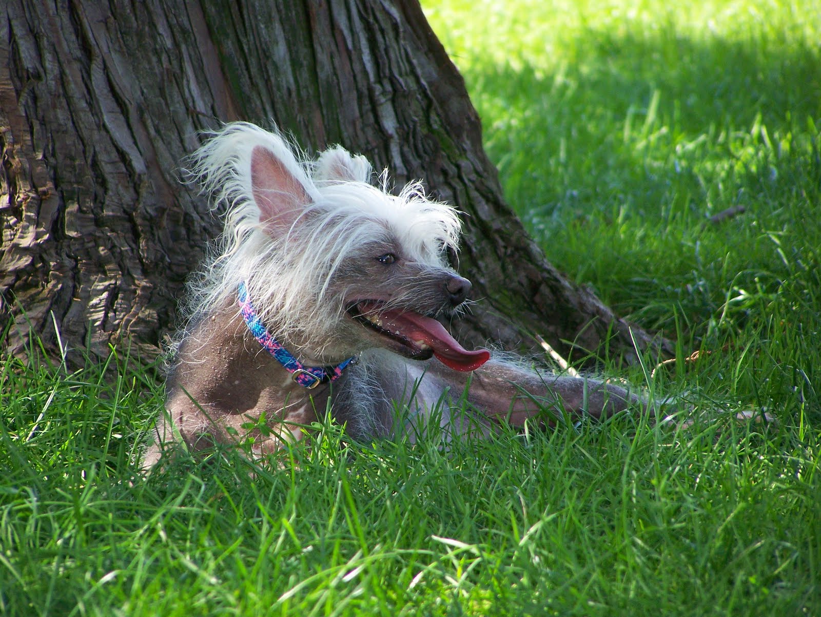 The Chinese Crested is a Hairless dog with decorative trim! These small, affectionate dogs stand nine to thirteen inches in height, weigh twelve pounds or less and live approximately thirteen to fifteen years. That's a long life, and therefore, a HUGE doggie commitment. I have had mine for almost 12 years, and she's still acting like a pup! Although there is little information available on the origin of this breed, it is believed that they originally descended from African hairless dogs and were transported to Asia by traders. They were further developed by the Chinese, who bred them to be smaller in size and used them to hunt vermin. Chinese Cresteds first arrived in the United States in the nineteenth century, but were not recognized by the American Kennel Club (AKC) until 1991.